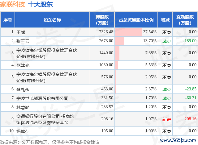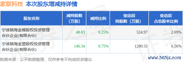 证券之星音书,12月24日家联科技发布公告《家联科技:对于公司控股鼓吹、本体放荡东谈主的一致行动东谈主减握股份涉及1%整数倍的公告》,其鼓吹宁波镇海金模股权投资处罚合股企业(有限合股)、宁波镇海金塑股权投资处罚合股企业(有限合股)于2025年11月20日至2025年12月23白天所有减握194.37万股,占公司现在总股本的0.9959%,变动技艺该股股价飞腾9.67%,截止12月23日收盘报22.0元。 鼓吹增减握笃定见下表:  笔据家联科技2025年三季报公布的十大鼓吹笃定如下: